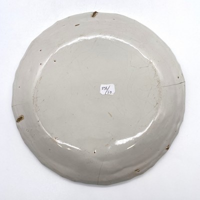 ASSIETTE à bord contourné, en faïence à décor polychrome au centre d'un homme debout sur une terrasse et tenant une ombrelle et un panier.