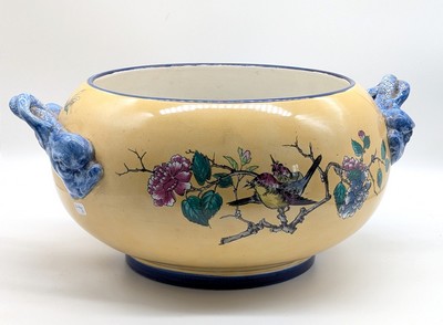 CACHE-POT en faïence émaillée polychrome à fond jaune figurant des oiseaux branchés et pivoines sur la panse. Anses zoomorphes représentant des dauphins de style classique.