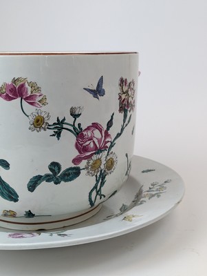 CACHE-POT en faïence fine à décor de branches de fleurs et papillons, anses en mascarons. Style Marseille.