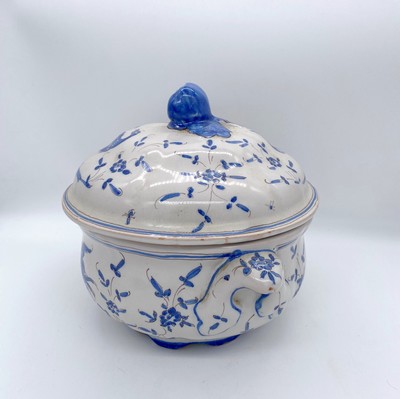 POT A OILLES en faïence émaillée à décor bleu sur fond blanc d'oiseaux et œillets.