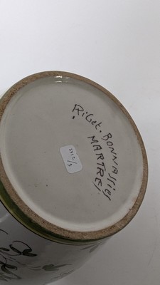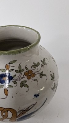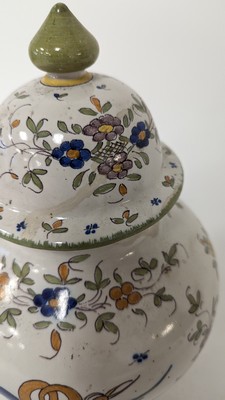 POT COUVERT de forme balustre en faïence émaillée polychrome à décor de deux grues combattant dans une réserve de semis de fleurs. La prise du couvercle en toupie.