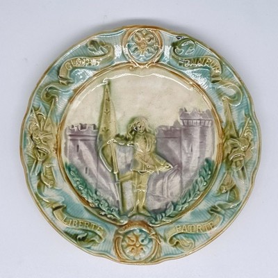 PLAT circulaire en faïence émaillée, à bords contournés, représentant Jeanne d'Arc à cheval. L'aile à décor alterné dans des réserves de semis de fleurs, de blasons armoriés et d'une inscription "En avant" dans un cartouche.