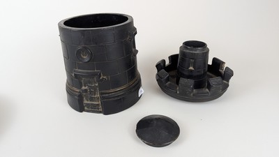 POT A TABAC en trois éléments en faïence émaillée noir, en forme de tour fortifiée avec blason.