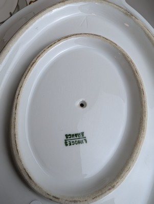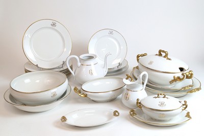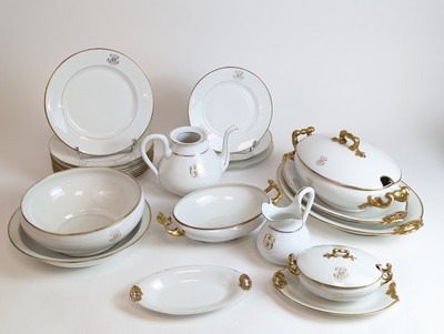 SERVICE DE TABLE en porcelaine émaillée blanc à monogramme FB et filets or, comprenant :