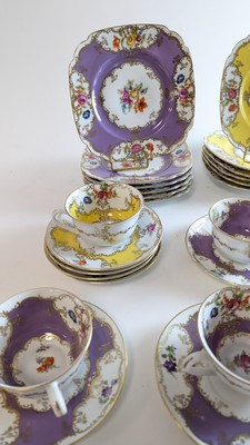 PARTIE DE SERVICE en porcelaine émaillée violet ou jaune à décor dans des réserves rehaussées à l'or de semis de fleurs (roses, bleuets, coquelicots) comprenant : SIX TASSES,DIX SOUS-TASSES et DOUZE ASSIETTES à dessert.