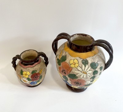 PETIT VASE BALUSTRE pansu à deux anses latérales en céramique émaillé polychrome à décor de coquelicots, bleuets et marguerites.