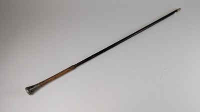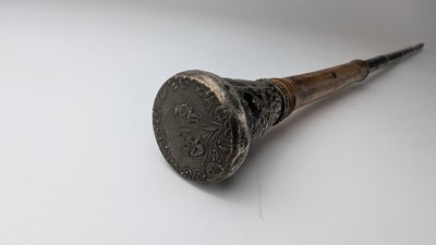 CANNE en bambou à pommeau en argent (925) à décor au repoussé d'une frise d'angelots jouant de l'aulos dans un encadrement de rinceaux.