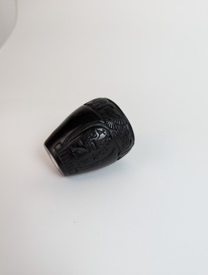 PARTIE DE VASE canope en pierre noire sculpté d'un hiéroglyphe surmonté d'une frise figurant deux serpents ailés affrontés.