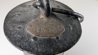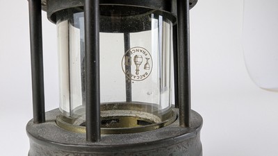LAMPE DE MINEUR en tôle laquée noir. Réflecteur en verre moulé pressé signé Baccarat.
