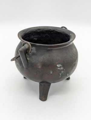 PETIT CHAUDRON en bronze de forme boule reposant sur une base tripode à anses triangulaires.