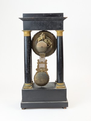 PENDULE portique en bois noirci à quatre colonnes baguées de bronzes dorés, cadran en bronze, base et fronton ornés de zéphyr, palmettes et rinceaux. Balancier à rosace de feuilles d'acanthe et serpents en chute.