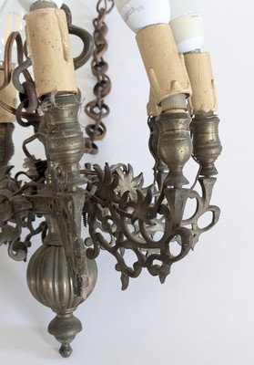PETIT LUSTRE en bronze à sept bras de lumières sur goupilles. Fût balustre godronné.
