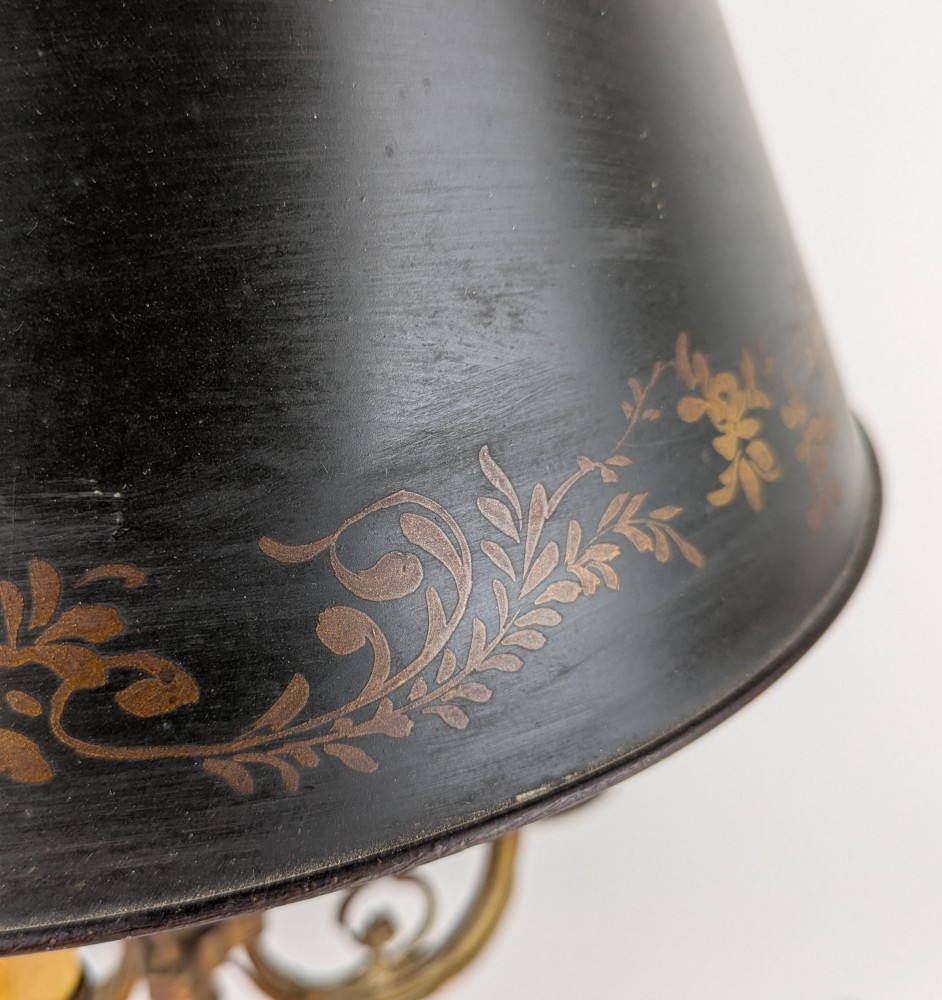 LAMPE BOUILLOTTE en bronze doré à trois bras de lumière en enroulement feuillagé, base circulaire en coupelle, abat-jour en tôle laqué vert.