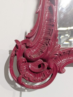MIROIR rectangulaire biseauté dans un cadre en bois stuqué anciennement doré, à motif rocaille, relaqué rouge.