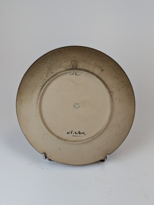 ASSIETTE décorative en grès émaillé marqué "Gora Arin Gora Donibandarrak - 1982" avec fanion du club de football Arin Luzien, chalutier et croix basque. Signée C. Fischer et marquée au tampon.
