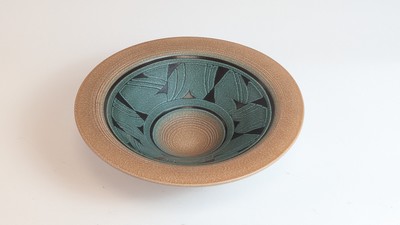 COUPE en faïence émaillée brun vert et noir à décor de feuillage stylisé. Signée sous la base.