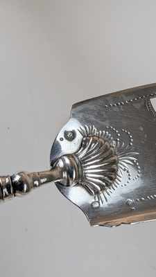 PELLE A POISSON en argent (950) à spatule ajourée et ciselée d'un poisson dans des rinceaux, manche en bois noirci.