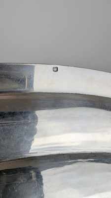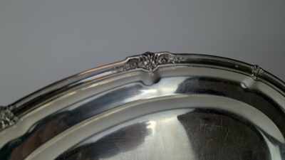 PLAT ovale en argent (950) à bordure moulurée et agrafes feuillagées.
