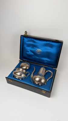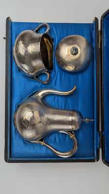 PETITE THÉIERE et SUCRIER couvert en argent (950) à décor de médaillons chiffrés sur fond guilloché, frétel en toupie.