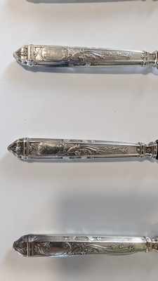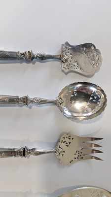 PARTIE DE SERVICE A CONFISERIES comprenant une spatule, deux fourchettes et une cuillère en argent (950) et argent (950) fourré à décor ciselé de fleurs de chardons.