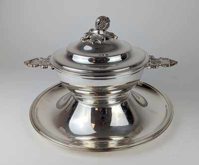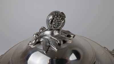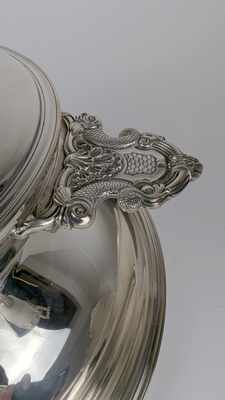ÉCUELLE à oreilles en métal argenté sur son PRÉSENTOIR à doucine, pouvant former CENTRE DE TABLE, les anses à motifs de dauphins, écailles et coquilles, le frétel en grenade.