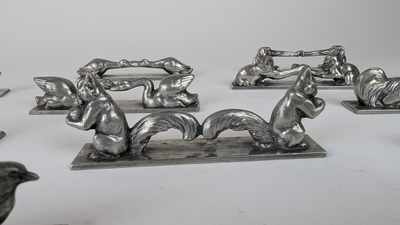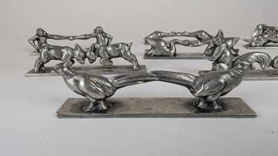 DOUZE PORTE-COUTEAUX en métal à décor d'animaux affrontés tous différents (carpes, éléphants, oies, faisans, chevreaux, coqs, homards, écureuils, chats, singes, escargots, cygnes). Base rectangulaire à effet martelé.