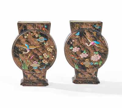 PAIRE DE VASES à corps circulaires en faïence émaillée polychrome à décor de style Japoniste de grue, insectes, branchages fleuris et artefacts. Signés au tampon et en creux.