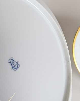 SUITE DE NEUF ASSIETTES en porcelaine émaillée blanc. L'aile rehaussée d'un filet doré.