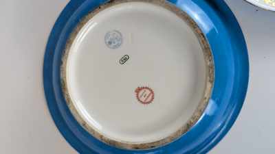 PAIRE D'ASSIETTES à bords contournés en porcelaine émaillée polychrome à décor dans le bassin d'un chiffre aux L entrelacés entouré de putti. L'aile et le marli à fond jaune rehaussé de motifs dorés à décor de guirlandes de laurier.