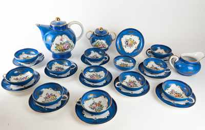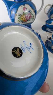PARTIE DE SERVICE A THÉ en porcelaine émaillée polychrome à fond bleu céleste et à décor en réserve de semis de fleurs sur fond blanc rehaussées d'agrafes dorées comprenant :