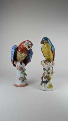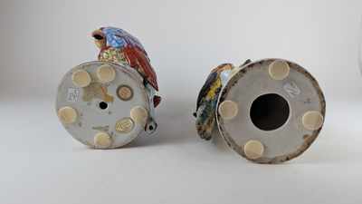 DEUX PERROQUETS branchés en porcelaine émaillée polychrome, l'un avec lézard sur le tronc.