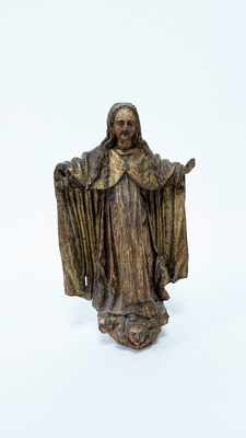 VIERGE DE L'ANNONCIATION en bois mouluré et sculpté polychrome et rehaussé à l'or représentant le Vierge aux bras ouverts et reposant sur une nuée d'angelots.