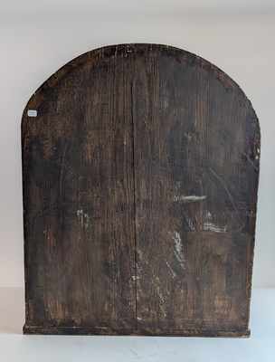 GRAND BUSTE en noyer mouluré et sculpté en ronde-bosse représentant le Christ de douleur à fond cintré.