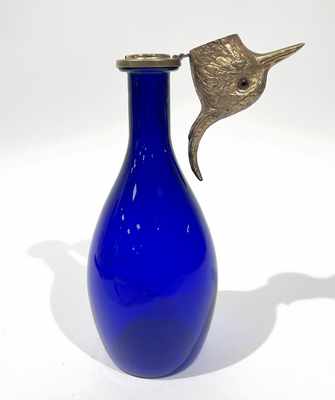 CARAFE en verre moulé soufflé et teinté bleu à monture en bronze doré et ciselé à décor d'une tête d'aigrette. Les yeux en sulfure.
