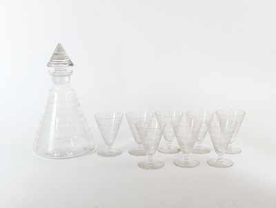 PARTIE DE SERVICE A LIQUEUR en verre moulé soufflé de forme tonneau à pans comprenant une petite carafe et huit verres.