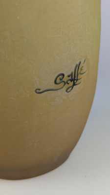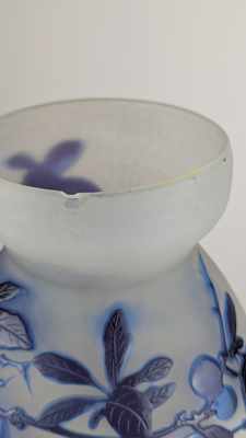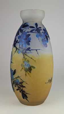 VASE ovoïde à col ourlé en verre moulé soufflé à décor multicouche dégagé à l'acide de branches de prunus sur fond opalescent jaune. Signé en camée.