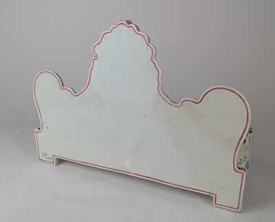 ENCRIER double, en faïence émaillée, à décor néoclassique deux fleurs et insectes en rose et grisaille, le dosseret avec Amour dans un médaillon retenu par des guirlandes et un tiroir en ceinture à décor de putti à la chasse aux papillons; godets d'origine en pétales de fleurs.