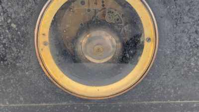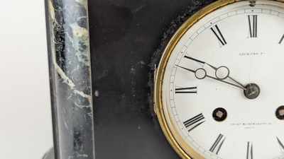 PENDULE borne à base rectangulaire en marbre noir et à bords arrondis en marbre vert-de-mer. Le cadran émaillé à chiffres romains signé Richond à Paris. Aiguilles Breguet. La base surmontée d'un groupe en bronze à deux patines à décor de la Vierge à la chaise d'après Raphaël.