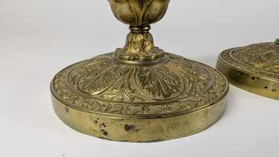 PAIRE DE FLAMBEAUX en bronze ciselé à fût cannelé. Base circulaire à décor de palmettes et de raies-de-cœur.