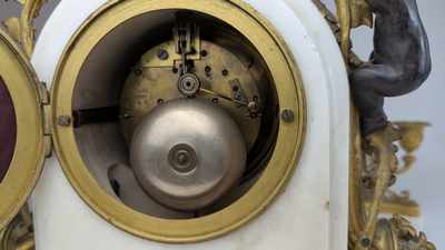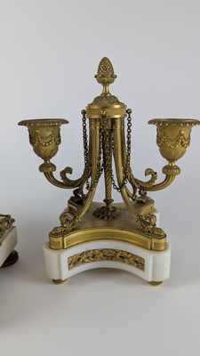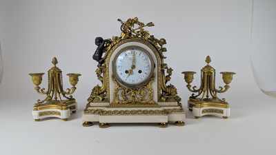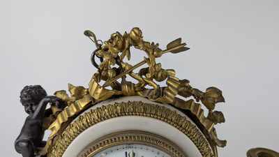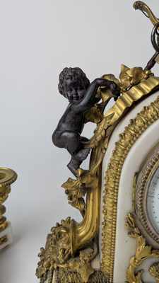 GARNITURE DE CHEMINÉE comprenant une pendule et deux petits candélabres en bronze ciselé à décor d'un amour (mobile et possiblement rapporté) en bois sculpté escaladant une corne d'abondance. Le cadran émaillée à chiffres arabes signé "Denière Ft de Bronzes - Paris" comme le mouvement et...