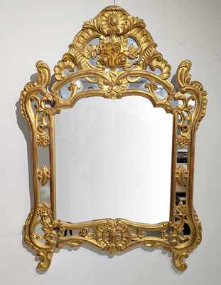 MIROIR à parecloses, en bois sculpté et doré, le fronton à motifs de coquilles et bouquets de roses.