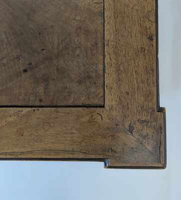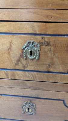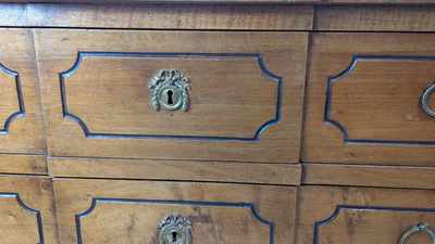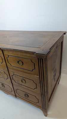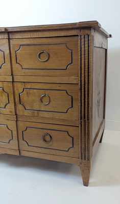 COMMODE en noyer et placage de noyer ouvrant en façade à trois tiroirs sur trois rangs. Montants droits cannelés et rudentés. Pieds gaines fuselés. Entrées de serrures à décor de nœuds rubanés.