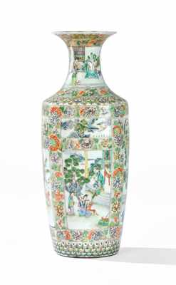 VASE de forme balustre en porcelaine émaillée polychrome, à décor en réserve de scènes de palais, paysages ou oiseaux branchés, sur fond de fleurs de lotus.
