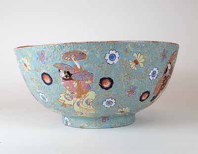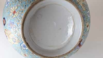 AQUARIUM en porcelaine émaillée turquoise à motifs de semis de fleurs et danseurs aux éventails.