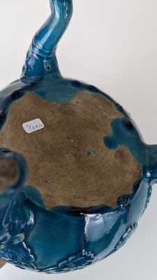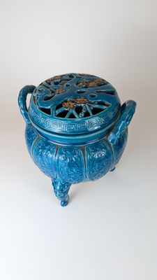 BRÛLE-PARFUM en céramique émaillée turquoise et rehaussée à l'or à décor d'arbre en fleur. La panse ornée d'une frise de cartouches fleuris et reposant sur trois pieds à forme de mufles de chimères.
