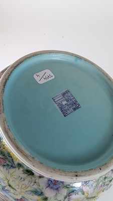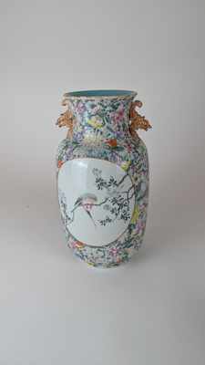 VASE balustre en porcelaine émaillée famille rose à décor en réserve de perruches branchées, l'une tenant une mante-religieuse dans son bec, sur fond à décor en plein de fleurs, anses en forme de chauve-souris émaillée corail, col et talon turquoise, avec marque impériale Qianlong apocryphe.
