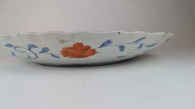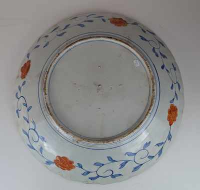 GRAND PLAT circulaire en porcelaine émaillée à décor Imari asymétrique à motifs de panier fleuri sur fond végétal.