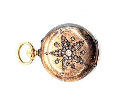 MONTRE SAVONNETTE en or (750) à décor sur le clapet d'une étoile sertie de petits diamants taille brillant. Cadran émaillé à chiffres romains avec compteur des minutes en chiffres arabes. Compteur des secondes à 3h. Le revers chiffré CS. Cache-poussière d'origine en or. N° 21624.
