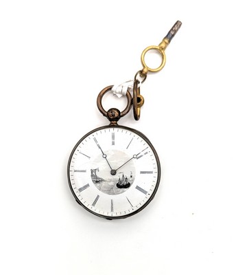MONTRE DE GOUSSET à boîtier en argent (800), à cadran émaillé blanc à chiffres romains et à décor peint à l'émail d'une scène maritime animée. Aiguilles Breguet. Cache-poussière en argent (800) numéroté 3907 comme le couvercle.
