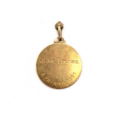 MÉDAILLE DE BAPTÊME en or (750) au profil de la Vierge. Bélière en forme de fleur. Le revers gravé "Anne-Louise" et daté "2 février 1951".